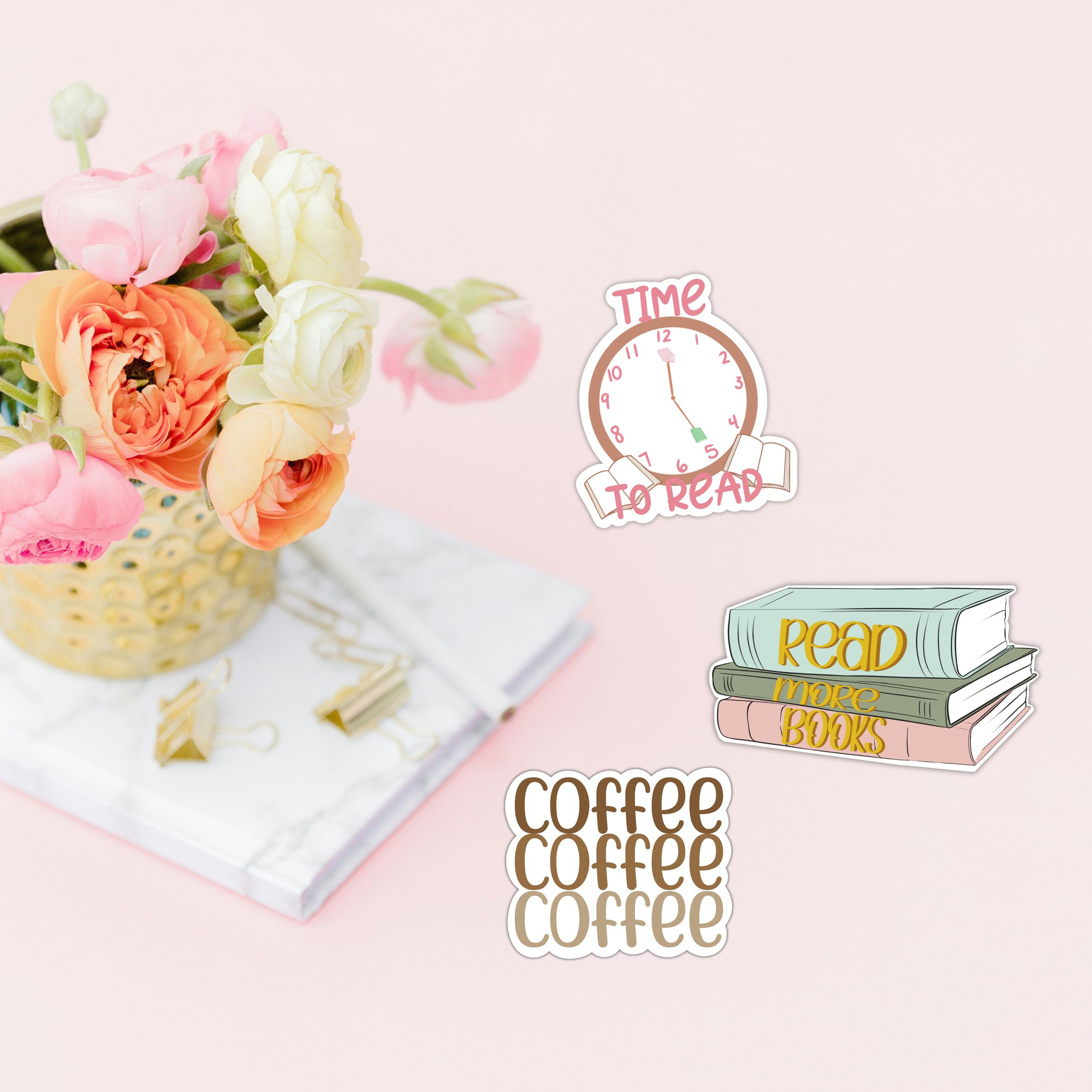 Decorative stickers and items on a white surface, including flowers, stacked books, a bow, and a gold stapler, with a central sticker that says "coffee coffee coffee".